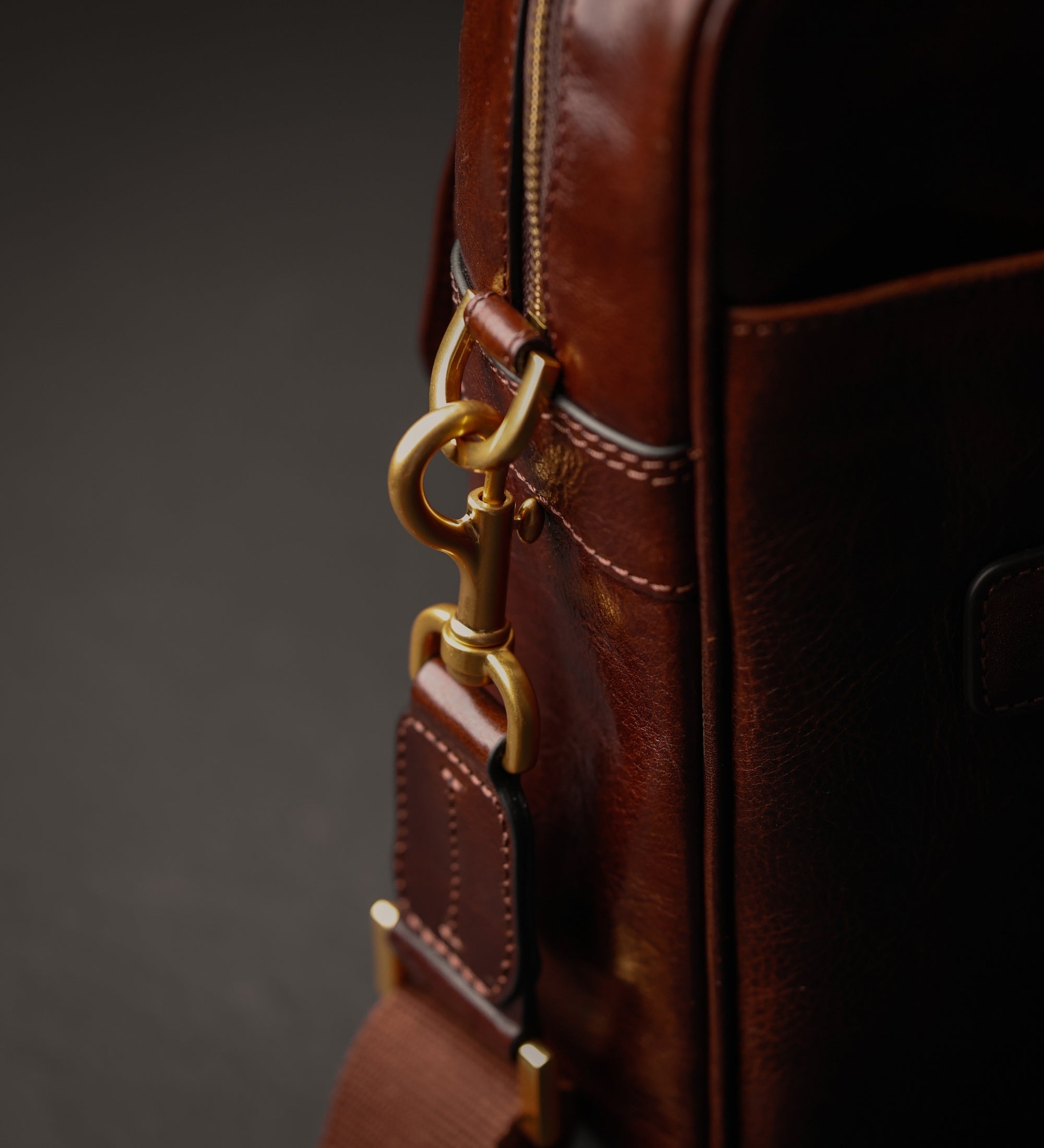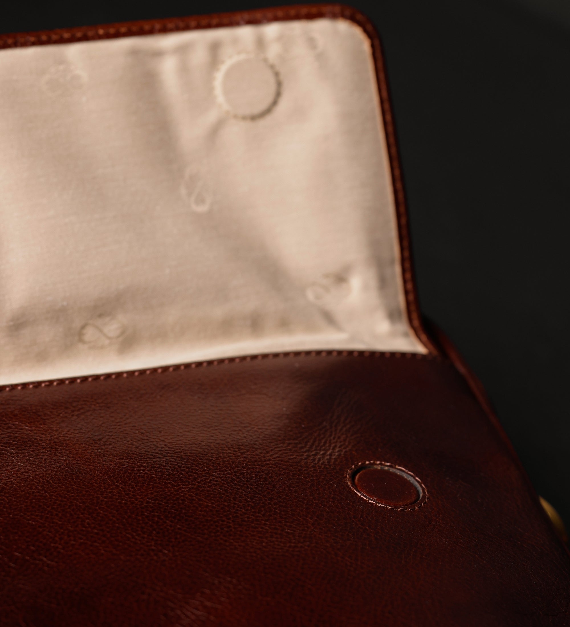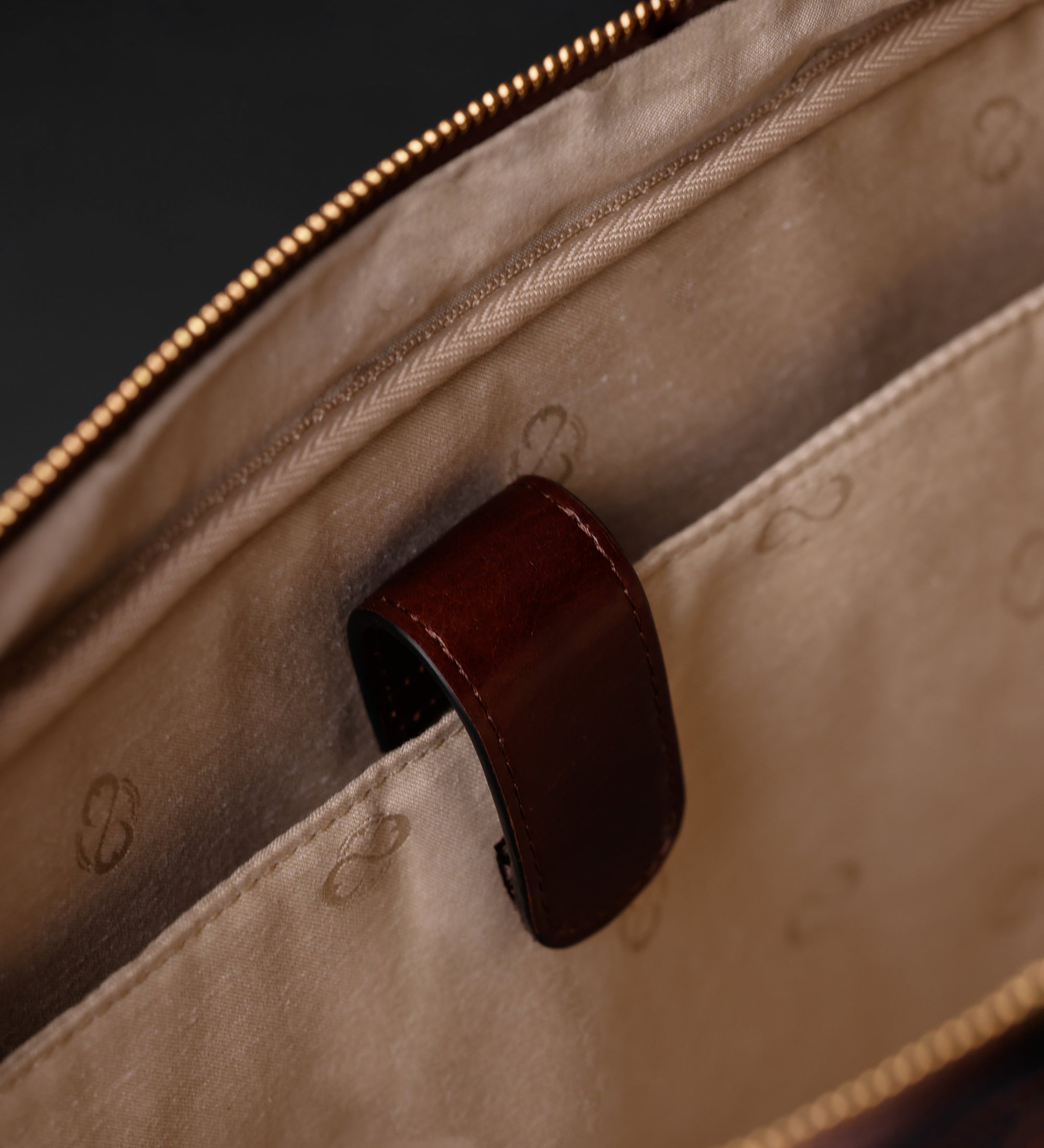 The Sheltering Sky - cette sacoche en cuir est le compagnon idéal pour le travail ou les études. Son aspect solide répond parfaitement aux besoins des hommes et des femmes. Fabriqué en cuir italien pleine fleur, il est doté d’une sangle trolley et d’une bandoulière amovible, ce qui le rend idéal pour voyager. Ses compartiments spacieux peuvent facilement accueillir des documents A4, des dossiers et un ordinateur portable 15 pouces. Si cela ne suffisait pas, nous avons fait une poche supplémentaire à rabat sur le devant avec une fermeture magnétique extra-forte, idéale pour garder vos objets essentiels facilement accessibles.