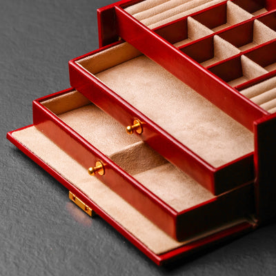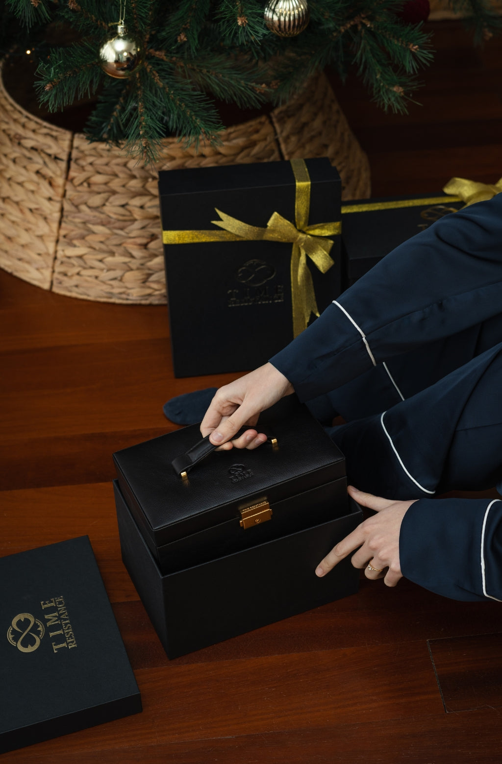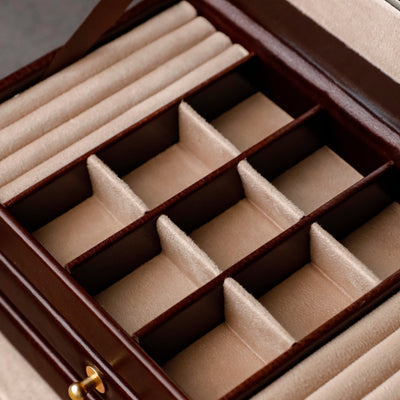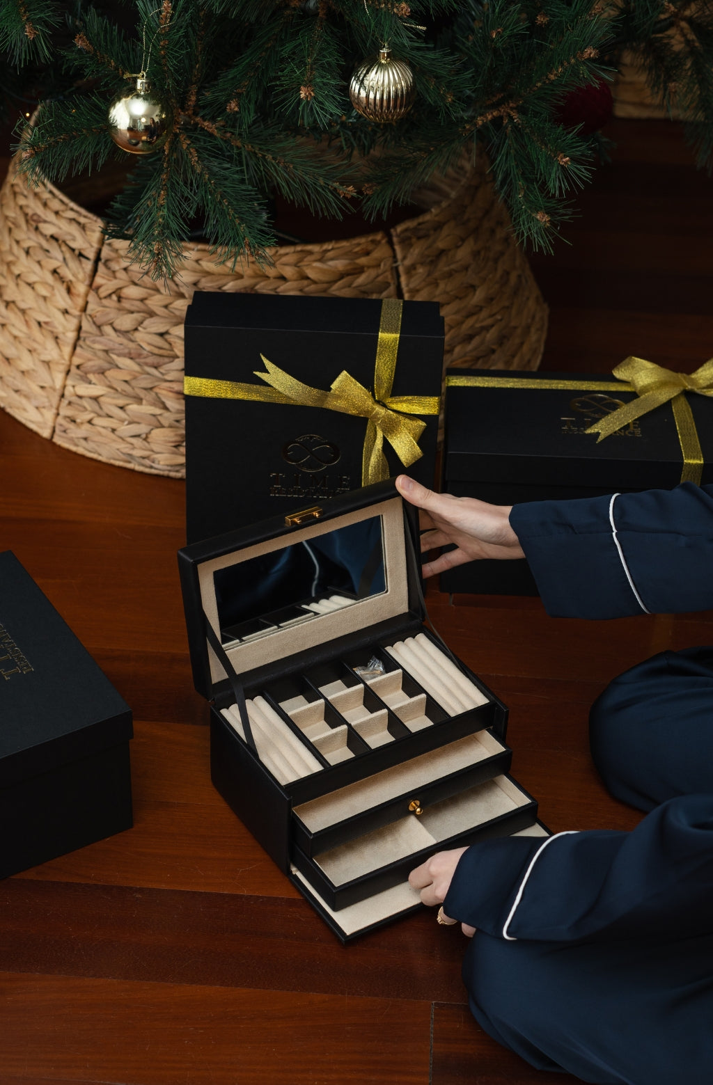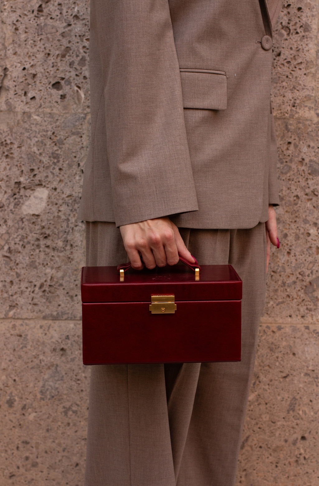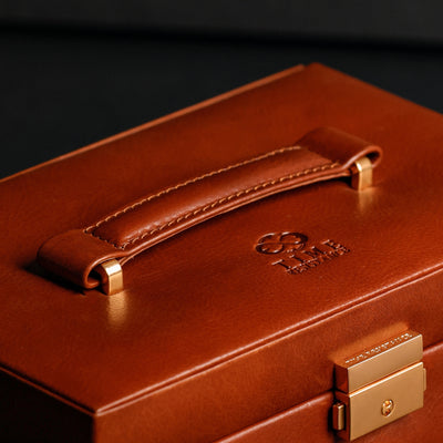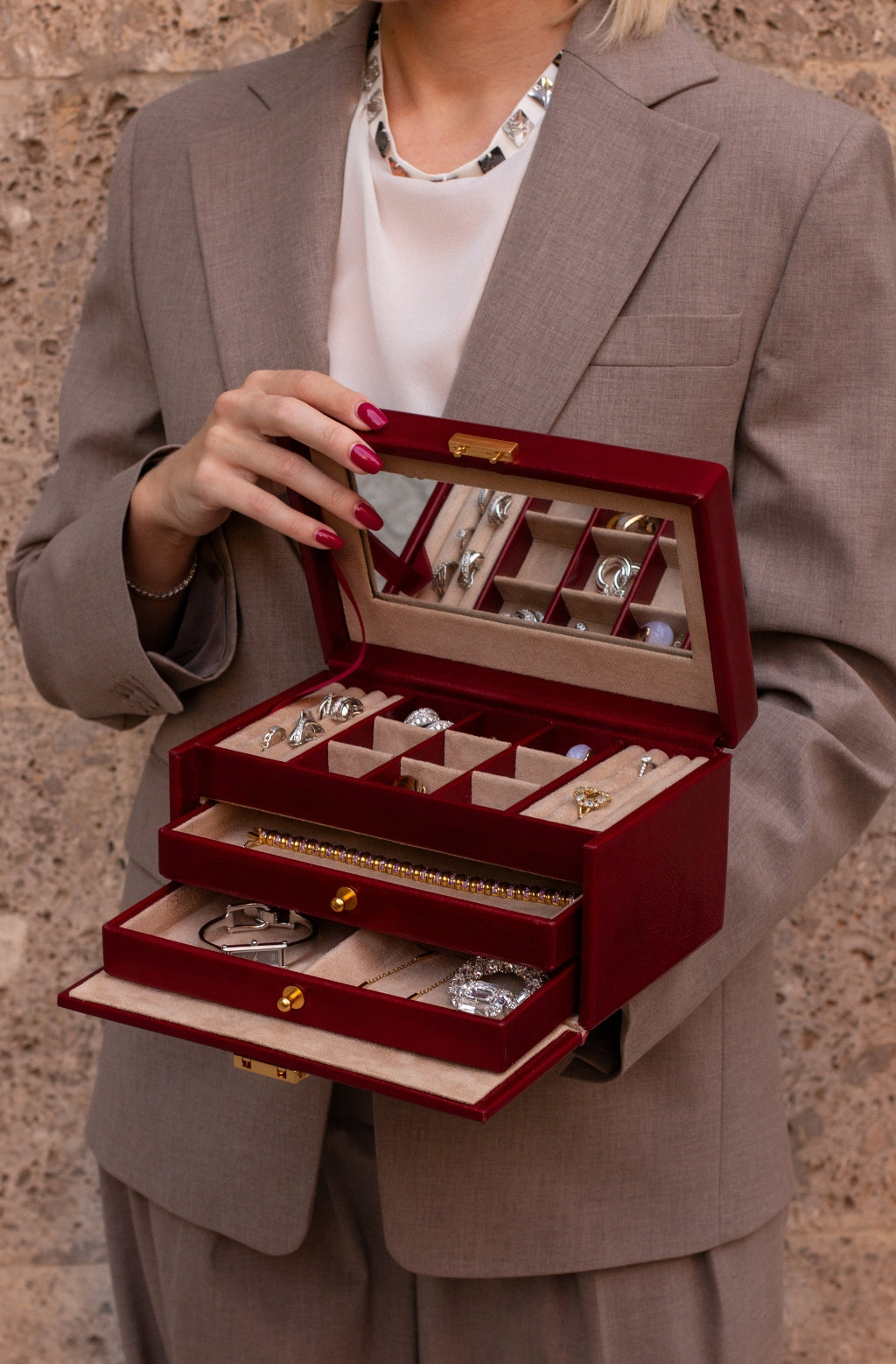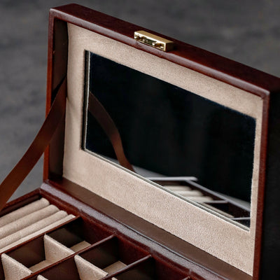 Notre majestueuse boîte à bijoux en cuir apportera une touche de luxe à votre coiffeuse. Avec son parfum d’élégance italienne, elle abritera vos précieux accessoires en toute sécurité. Elle est doublée d’un tissu doux pour protéger vos bijoux délicats et vos métaux précieux. Rangez et protégez vos bijoux !