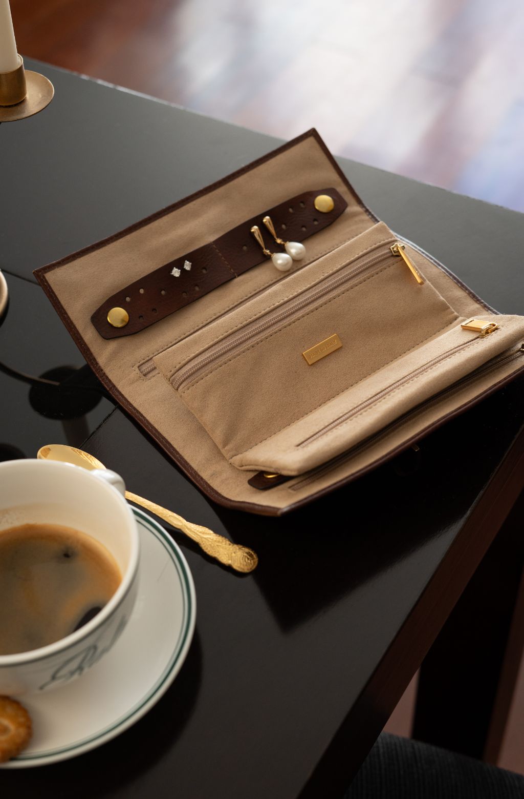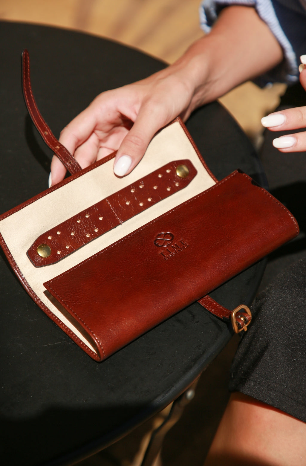 En dépliant cet écrin en cuir, vous découvrirez un refuge pour vos pièces les plus précieuses. Des compartiments et des poches soigneusement conçus accueillent vos bijoux ou vos produits de beauté, assurant qu’ils restent impeccables et protégés. Ce petit sac à rouler en cuir deviendra votre coffre au trésor personnel, protégeant vos objets de valeur avec style